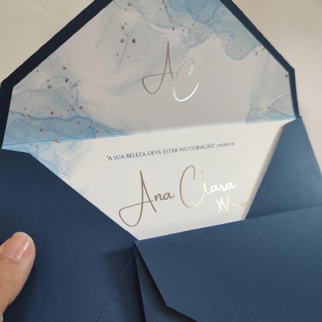 O convite contempla metalizado no forro do envelope, metalizado no nome da debutante, lacre de cera arte pré estabelecida(personalizamos acima de 100 uniddes) e caligrafia com impressão metalizada colada no verso do envelope.
