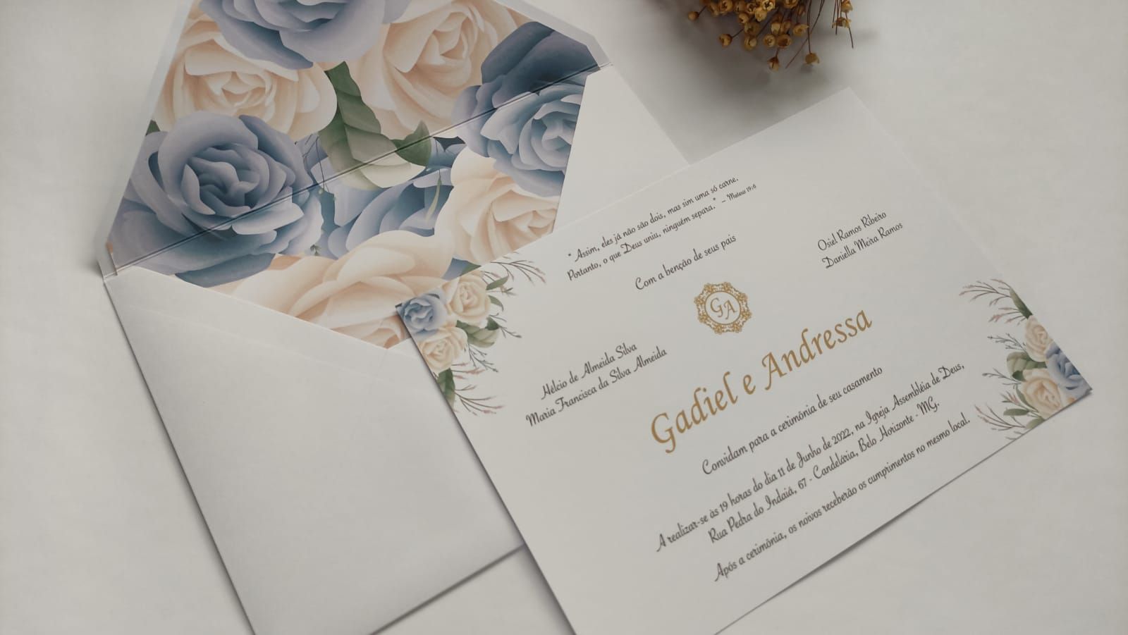 Convite Casamento Forrado Envelope Azul Branco Fosco