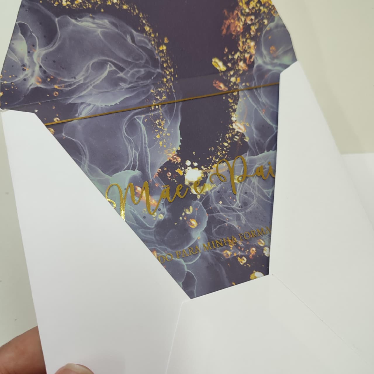 Convite interno em Acetato 30 micras o mais espesseo da categoria com impressão metalizada no dourado, prata e rosê gold, apenas.